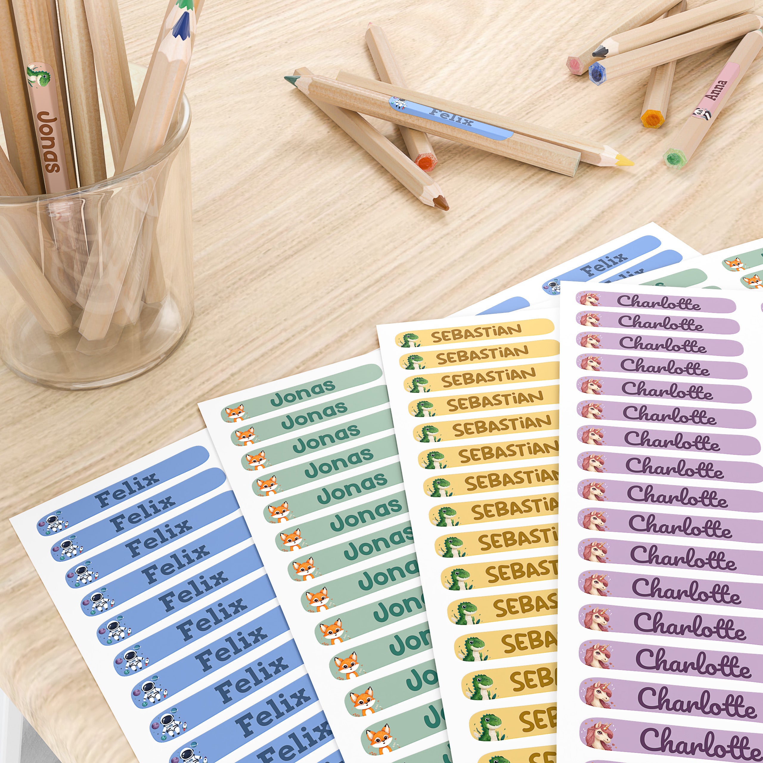 Namensaufkleber für Kinder – bunt, persönlich, haltbar. Markiere Schreibmaterialien und Gegenstände deines Kindes und sorge dafür, dass nichts mehr verloren geht – Tag für Tag, Jahr für Jahr.