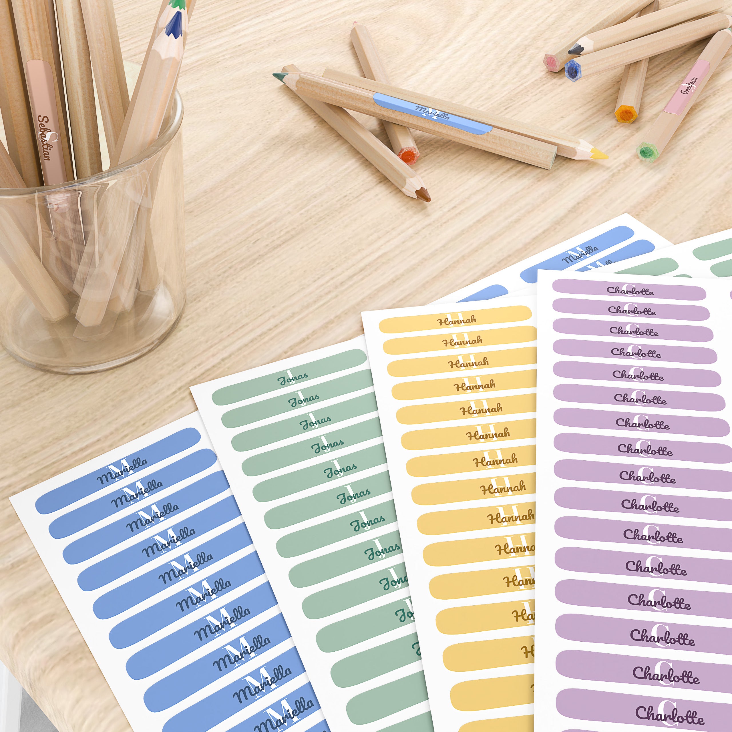 Namensaufkleber für Kinder – bunt, persönlich, haltbar. Markiere Schreibmaterialien und Gegenstände deines Kindes und sorge dafür, dass nichts mehr verloren geht – Tag für Tag, Jahr für Jahr.