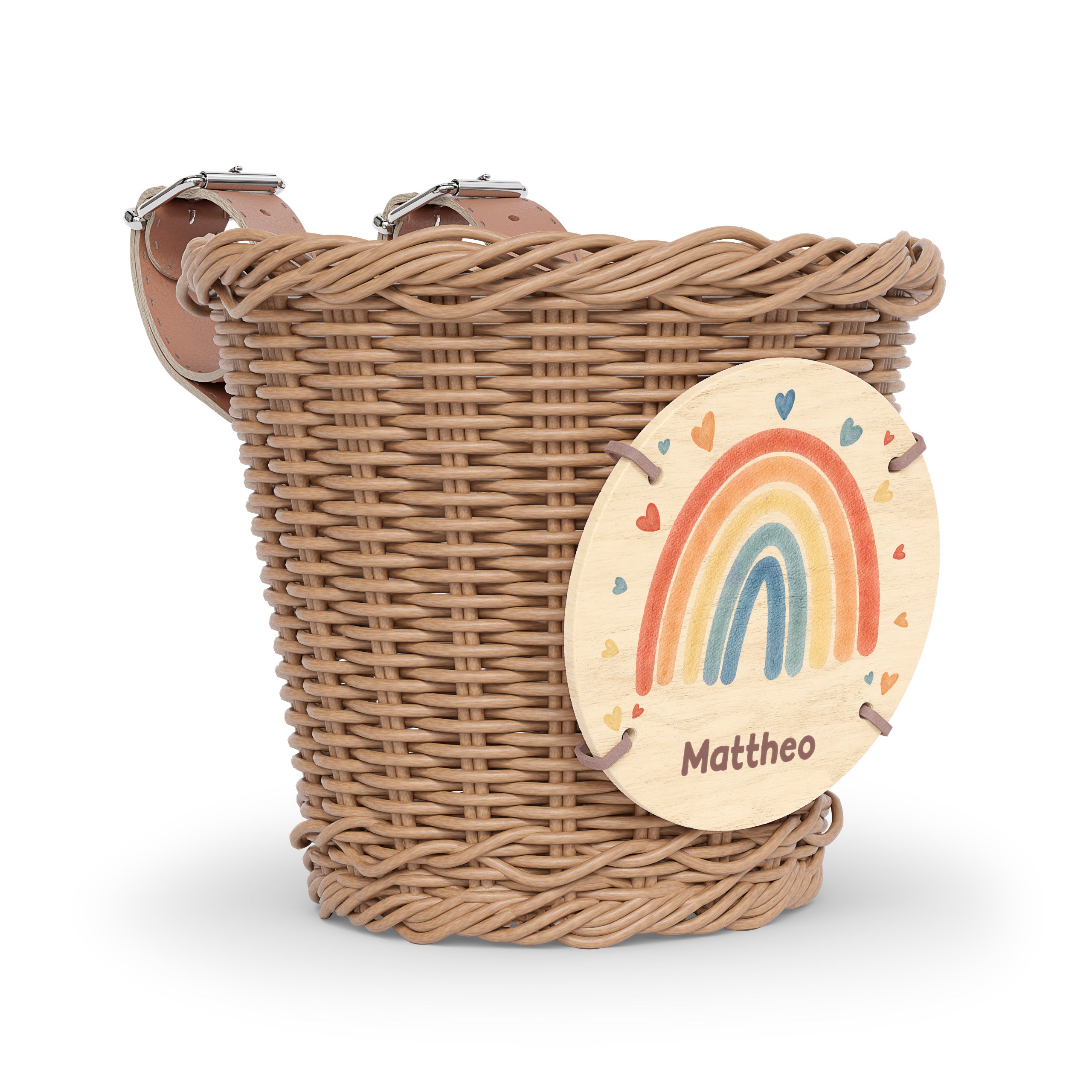 Personalisierbares Brettchen. – Dieses bunte Brettchen mit süßen Regenbogenmotiven ist ein wunderschönes Accessoire für unsere Laufräder, Fahrräder und Scooter. In unserem Konfigurator kannst du aus diversen Motiven auswählen und den Wunschnamen in Sechs unterschiedlichen Fonts hinzufügen. Das Brettchen hat eine Größe von 10 x 10 x 0,3 cm und lässt sich ganz einfach mit den beigefügten Bändern an unseren Körben befestigen.