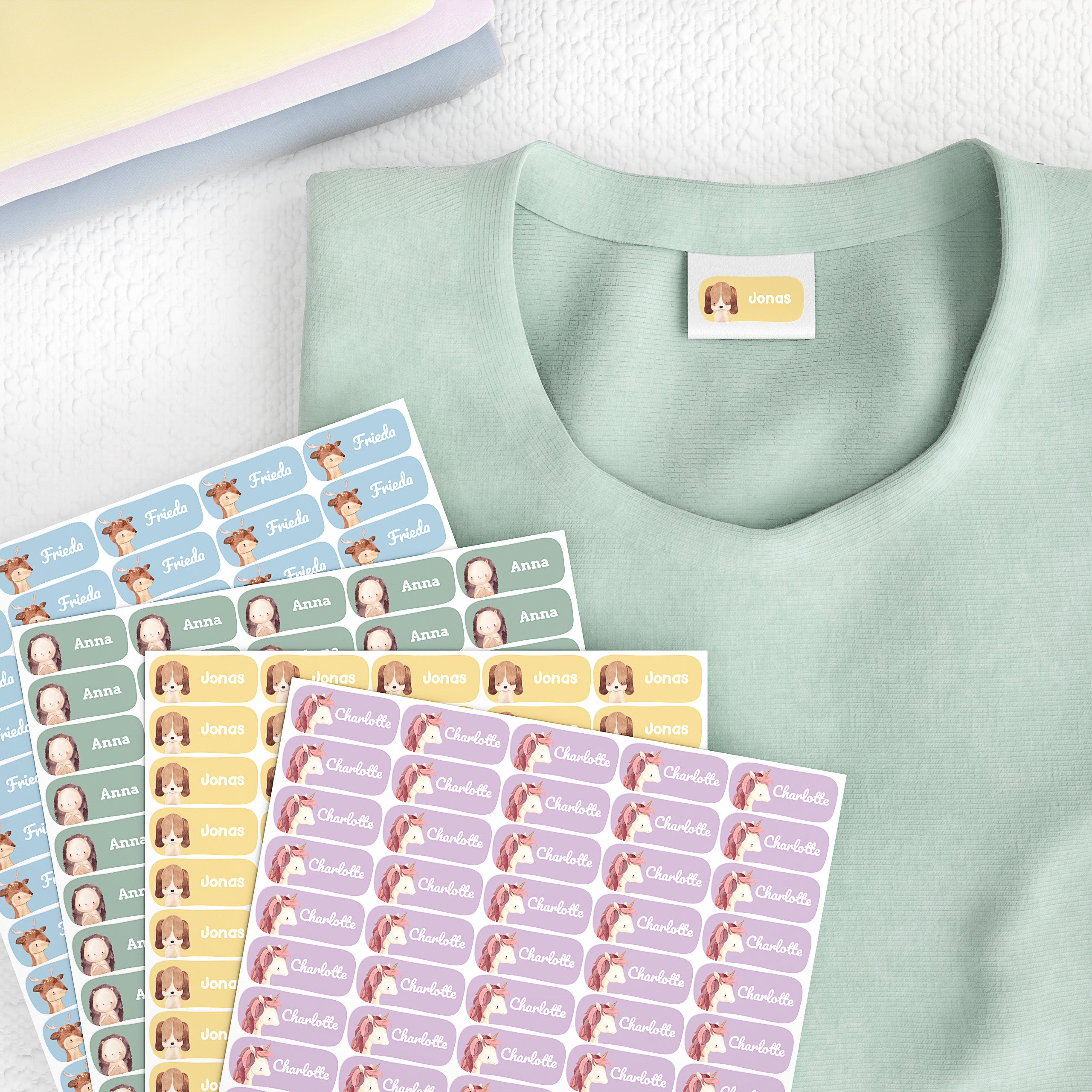 Namensaufkleber für Kinder – bunt, persönlich, haltbar. Markiere Kleidung und Gegenstände deines Kindes und sorge dafür, dass nichts mehr verloren geht – Tag für Tag, Jahr für Jahr.